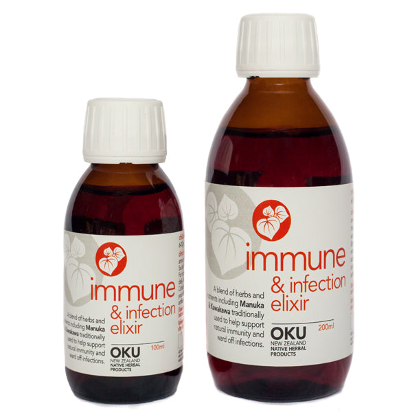 Oku Immune and Infection Elixir contains two key New Zealand Native Herbs Kawakawa and Manuka, combined with the two very well-known traditional western herbs of Olive Leaf and Echinacea purpurea. These herbs are blended with a lovely Rewarewa Honey Herbal Infusion of Elder Berries & Flower & the key immune nutrients of Vitamin C & Zinc.