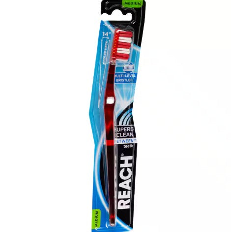The Reach Between brush has multi-level bristles that reach between teeth to remove plaque and help reduce surface stains.