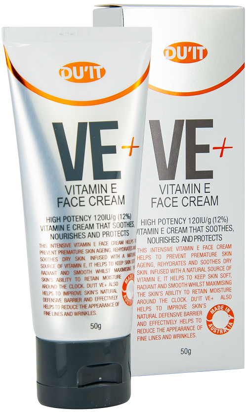 DU’IT VE+ Vitamin E face cream has a high potency 120iu/g or 12% of naturally derived Vitamin E which is 6 times that of standard Vitamin E creams for face. This Vitamin E moisturiser for face neutralises free radical activity, combats dehydrated and dry skin, fine lines and guards against premature aging skin. It's a rich moisturising Vitamin E face cream that hydrates, nourishes and protects skin. Enriched with the highest concentration of natural Vitamin E to help keep skin soft, radiant and supple whilst maximising the skin’s ability to retain moisture. DU’IT VE+ Vitamin E face cream improves skin’s natural defensive barrier and helps to reduce the appearance of fine line wrinkles. Recommended for uneven skin tones, sensitive skin, scarring, stretch marks, dry skin, after sun care and as under makeup moisturiser.