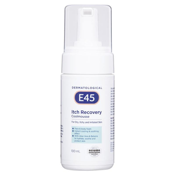 Itching and irritation of the skin can occur due to dryness or be triggered by external elements such as sun exposure, insect bites or allergens. E45 Itch Recovery Coolmousse instantly cools and soothes the skin, is fast absorbing, leaving your skin feeling calm, comfortable and moisturised. Can be used all over the body, face and hands. Suitable for the whole family. Perfume free.