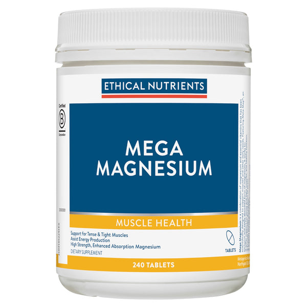 Mega Magnesium works to provide support for muscle tone and healthy muscle function, and supports tense and tight muscles. Magnesium may also benefit during times of stress, as well as supporting muscle relaxation and energy production, and support during the premenstual period. Ethical Nutrients Mega Magnesium provides a high dose of magnesium as well as Vitamin B6, Zinc, Selenium and Chromium.