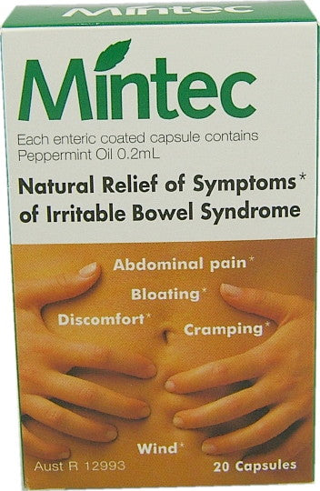 Mintec capsules contain peppermint oil, which is a natural, herbal antispasmodic. Mintec is an effective natural agent for the treatment of the abdominal pain, wind, cramps and spasm associated with Irritable Bowel Syndrome (IBS)