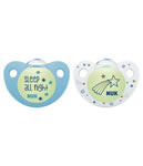 The NUK Glow in the Dark Soothers have the orthodontic NUK shape, an anatomically shaped mouth shield made of high quality plastic and a button which glows in the dark. The cheerful designs and colors are also stimulating during the daytime. All NUK soothers have the NUK Air System. Through the valve, air can escape from the teat part therefore staying soft and flat enough to prevent jaw deformities. Silicone is a largely rubber-elastic material of particular softness, extremely temperature resistant and tasteless.