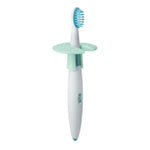The NUK Starter Toothbrush is ideal for helping babies learn to clean their own teeth. The soft, rounded bristles protect your little one’s sensitive gums. The non-slip handle allows parents to hold the toothbrush at the same time too. The protective ring prevents the toothbrush being put too far into your baby’s mouth and it can also be used as a stand.