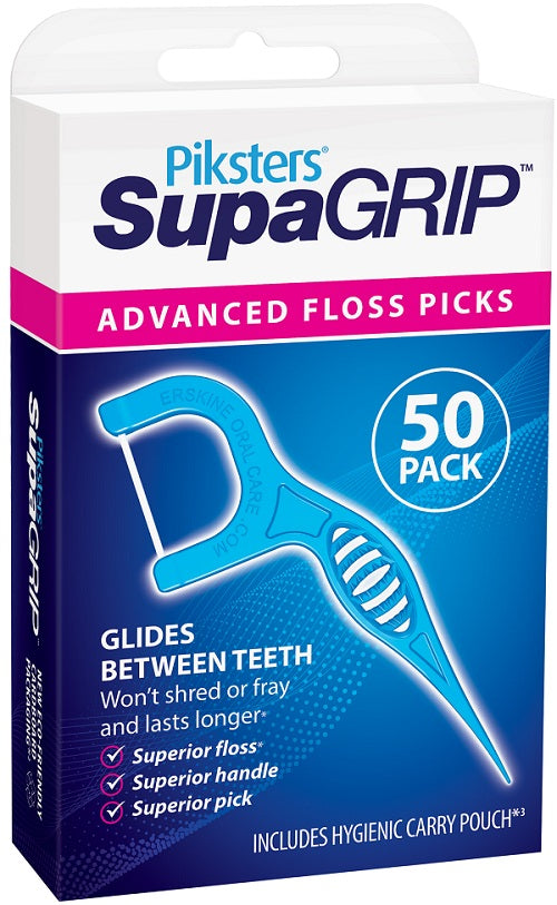 The Piksters® SupaGRIP™ is an advanced flosser pick designed with a superior floss, handle, and toothpick. Piksters® SupaGRIP™ contains the stronger and more durable monofilament PTFE. The flosser features a ribbed grip for improved control, and a big and long handle to easily reach your back teeth. The arms have a wide design to allow for easy cleaning between large molars.
